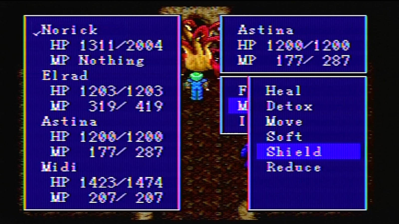 When I exited the volcano Astina showed up to join the party, informing me that was Mount Serbia and the wizard was the warlock. The king advanced out titles, and the story once more. With the bridge repaired we headed east. Midi was at the end of the bridge, and decided she was going to join as well. With a full party (I could tell from the menu), Norick had a full three people to watch him be awesome. Most often it wasn't worth spending MP to cast magic, and Norick had the strength to take enemies out in a hit or two. Midi did okay as a secondary fighter, but better as a backup healer. Astina was the main healer. I hung out around another restoration point in the next dungeon to make sure the other characters didn't fall behind too much in their stat gains.